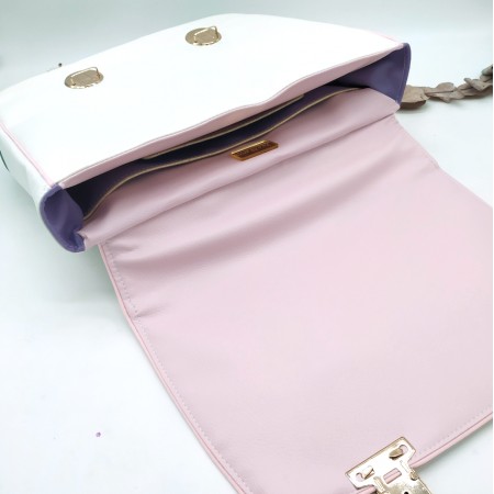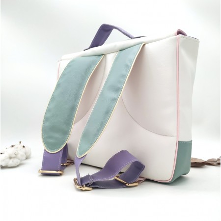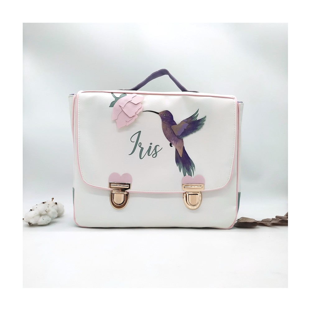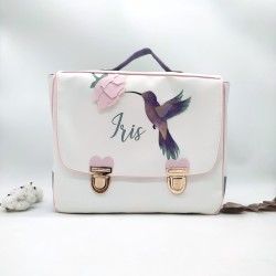Cartable format primaire colibri, rose, doré et violet, en cuir végane