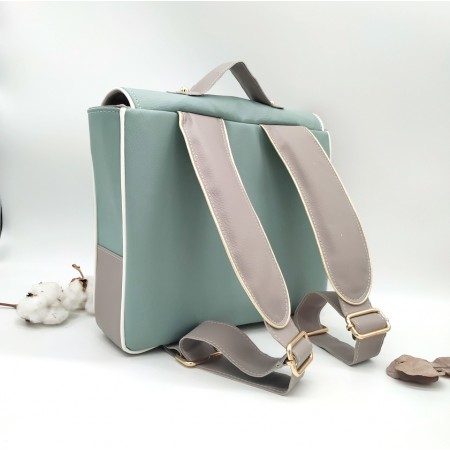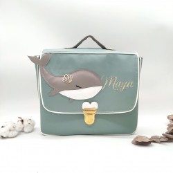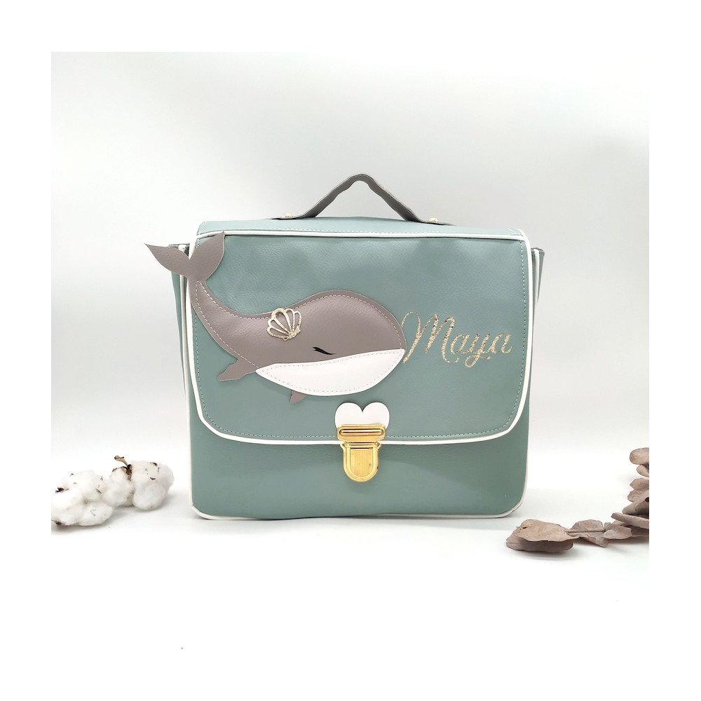 Cartable format maternelle baleine, vert et gris, en cuir végan