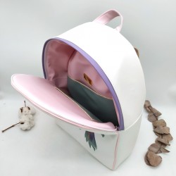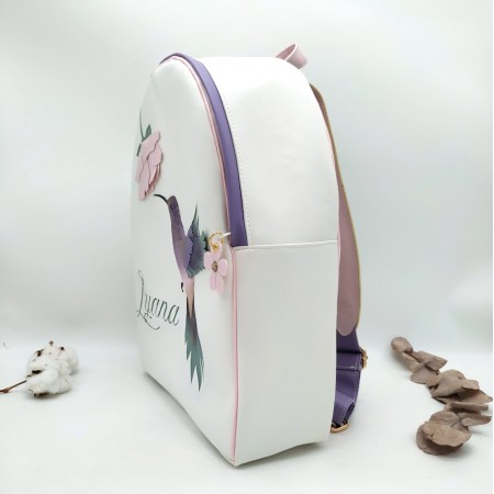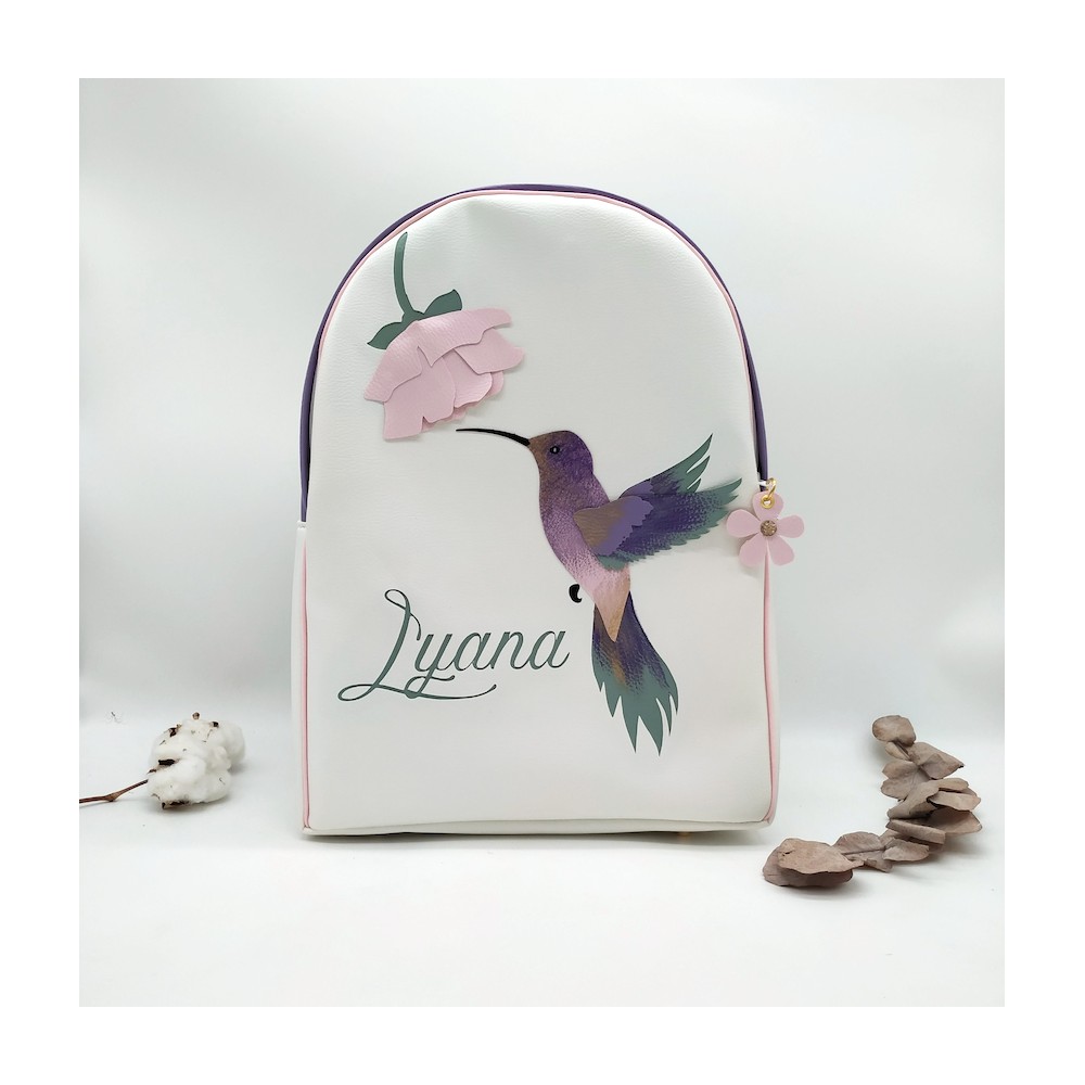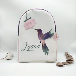 Sac à dos format primaire colibri, vert, violet et rose, en cuir végane, maternelle ou primaire